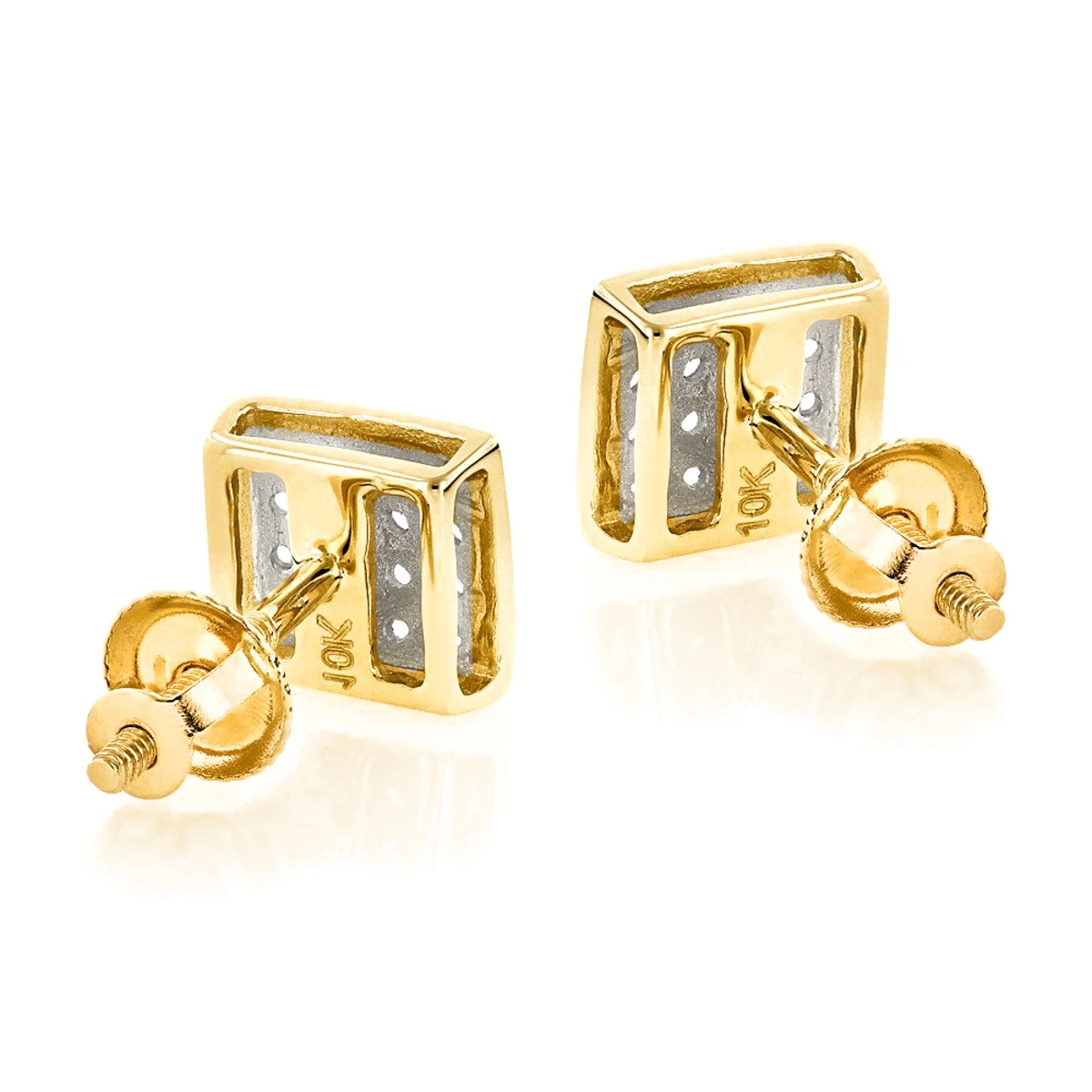 These 10K Yellow Gold Round Diamond Stud Earrings feature round cut diamonds, each pave set in shimmering 10K yellow gold. These versatile diamond earrings are a perfect size of about 6mm by 6mm and are just waiting for their new owner to show them off. These diamond studs feature 0.18 carats of genuine diamonds and pushback closures for convenient wear. Available in 10K white, yellow and rose gold.