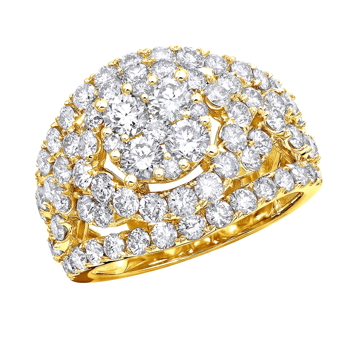 Right Hand Rings Collection: This gorgeous beyond stunning wide-shape diamond cluster ring for women represents the elegance and style. The ring captivates with 4 carat of diamonds by adding sparkle to this pretty cluster setting and unique design. This ring is 16mm wide and makes a great right hand ring or a very unique engagement ring with its prominent center setting and is available in 14K Yellow, White and Rose Gold.