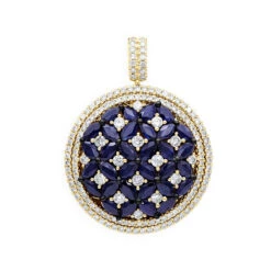 Royal Halo Round Shape Diamond Pendant For Women With Sapphires 14K White Gold