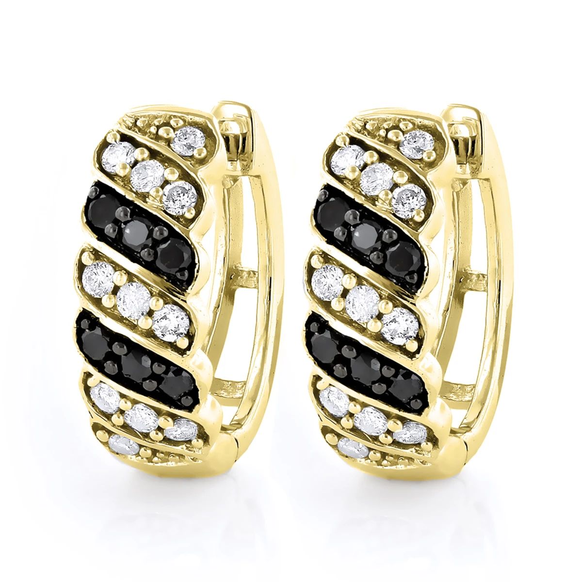 These exquisite 14K Gold White Black Diamond Hoop Huggie Earrings from our fancy color diamond jewelry collection showcase 0.65 ctw of sparkling white and black round diamonds, each masterfully prong-set in a swirl pattern. Featuring a unique look and a highly polished gold finish, these versatile diamond hoop earrings are available in 14K white, yellow and rose gold.