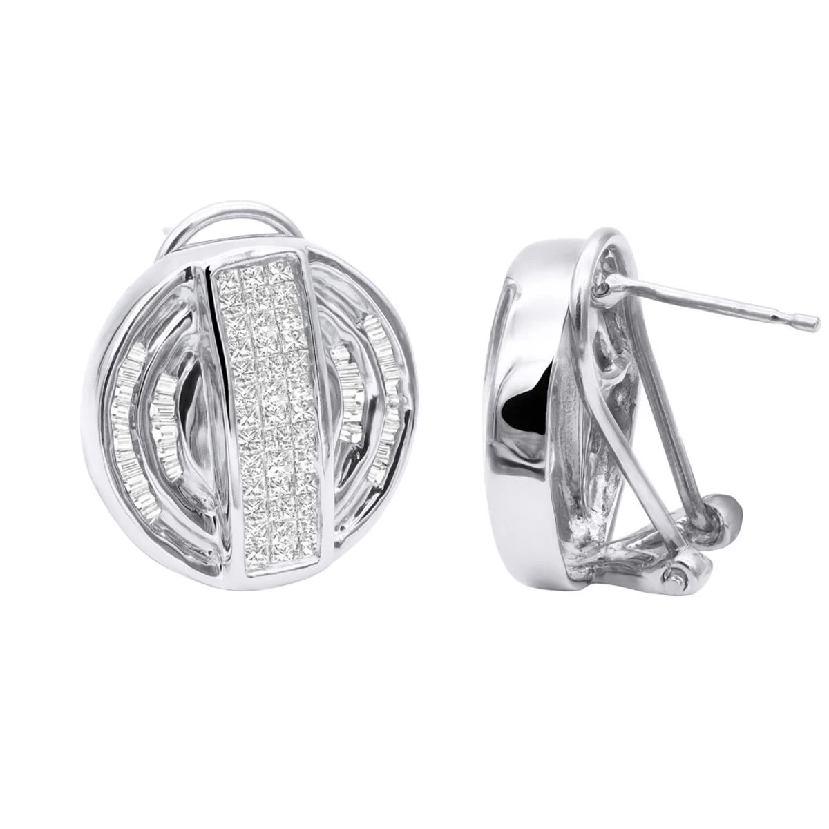 These 14K Gold Diamond Circle Earrings weigh approximately 8 grams and showcase 1.27 ctw of channel-set baguette diamonds and invisibly-set princess cut diamonds. Featuring an intricate design and a highly polished gold finish, these versatile diamond earrings are available in 14K white, yellow and rose gold.