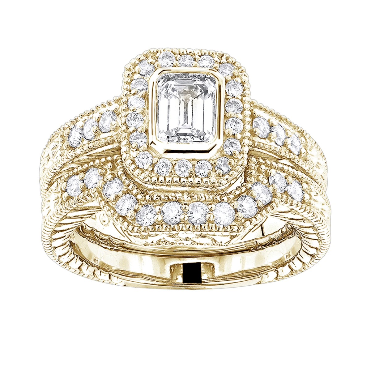 This 18K Gold Diamond Engagement Ring Set consists of a diamond engagement ring and matching band. The engagement ring showcases a 0.75 carat emerald cut diamond in the center and 0.31 carats of round diamonds on the sides for a total of 1.06 carats of dazzling diamonds. The band showcases 0.22 carats of dazzling round diamonds. This set is available in Platinum, 18k or 14k yellow, rose, white gold, various sizes, and can be customized with any color and quality diamonds. Please contact us if you would like to customize it.