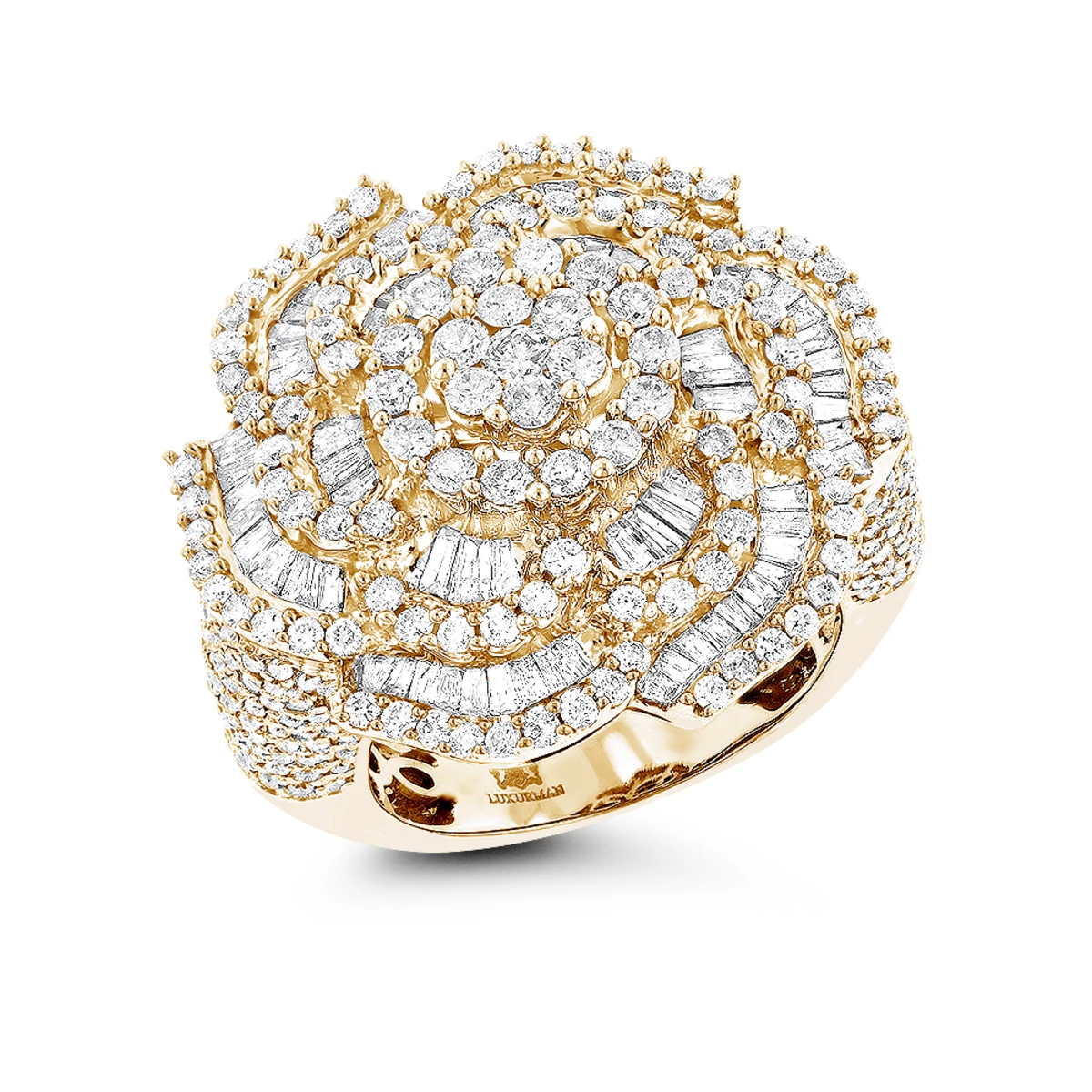 This custom made 18K Gold Flower Diamond Engagement Ring from our LUCCELLO designer statement jewelry collection weighs approximately 11 grams and showcases 3.25 carats of dazzling baguette and round diamonds. Featuring an intricate flower design and a highly polished gold finish, this diamond ring is the perfect way to say “I forever do”. Available in 18K white, yellow or rose gold.