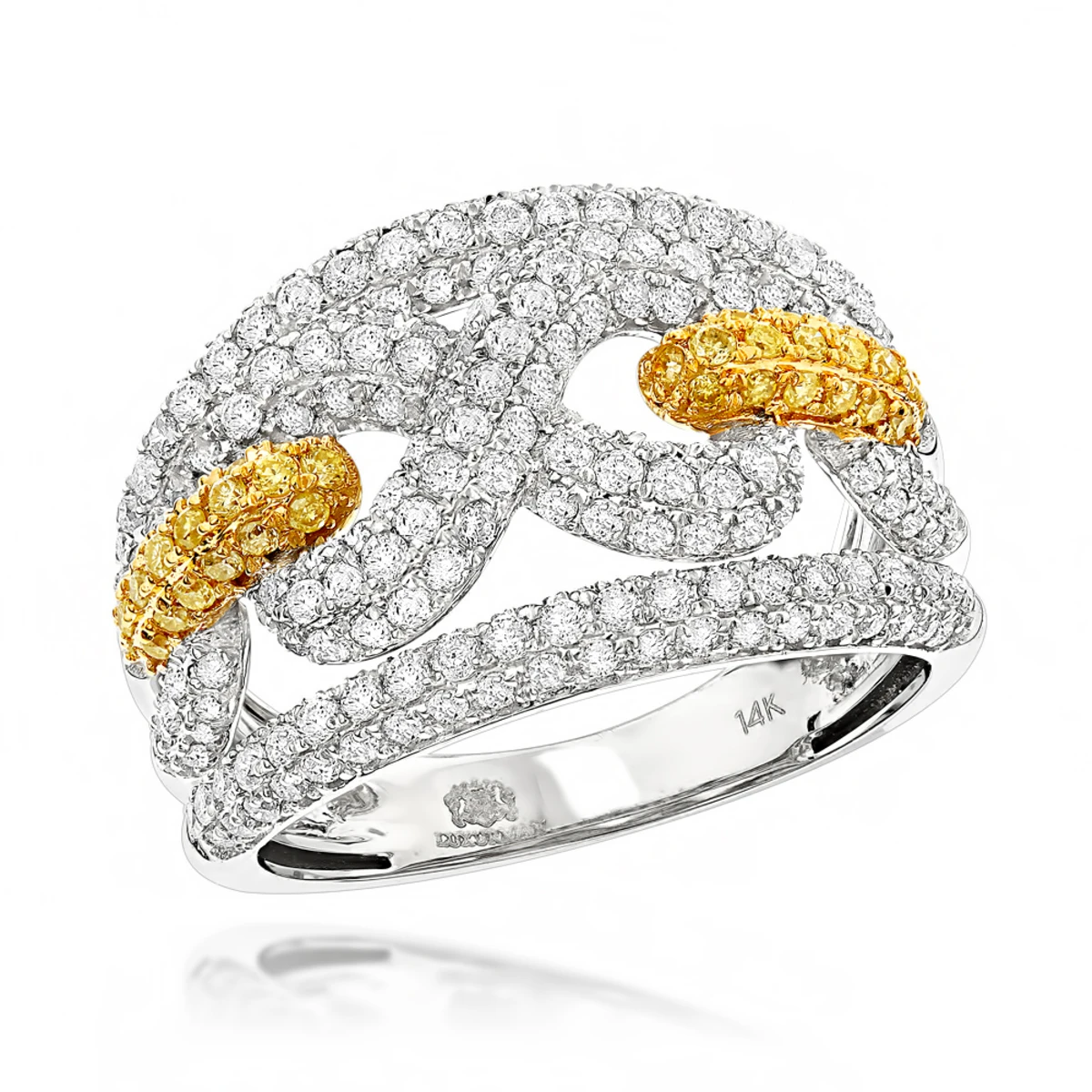 This Women’s White & Yellow Diamonds Infinity Cocktail Ring by Luxurman showcases 2 carats of dazzling round white diamonds and yellow diamonds masterfully set in 14K gold base. This beautiful ladies diamond ring is a great choice as a symbol if infinite love and will make a great and meaningful present! This designer diamond ring is available in 14K white gold, yellow gold and rose gold.