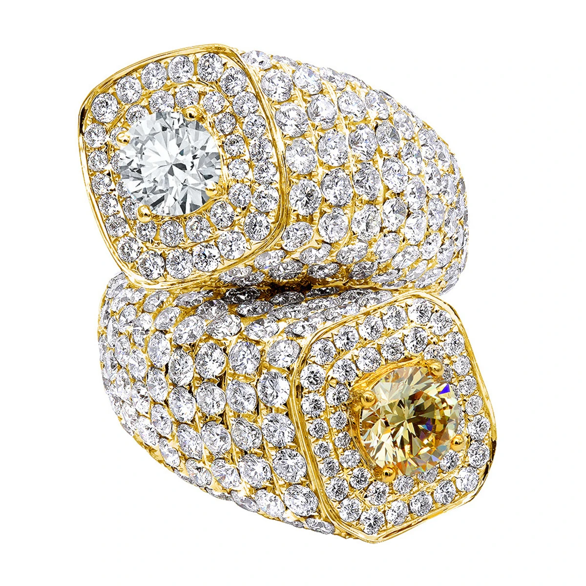 This bewitching 18K Gold 13 Carat Unique Diamond Right Hand Ring For Women features a one of a kind intricate design and is simply mesmerising. Right hand rings are status symbols for women all over the world. The band of this stunning right hand ring was meticulously crafted to resemble a fancy swirl and is fully iced out with round pave set white diamonds. The large white and yellow round diamonds at both ends of the dazzling swirl also serve to express your unique individuality. The feminine arrangement of this ring won’t leave anyone indifferent and will be an exclusive addition to any jewelry collection. Bold and flawless, this diamond ring is available in all 18K gold colours (white, rose and yellow) to give you a choice in the important matter of picking a perfect right hand piece.