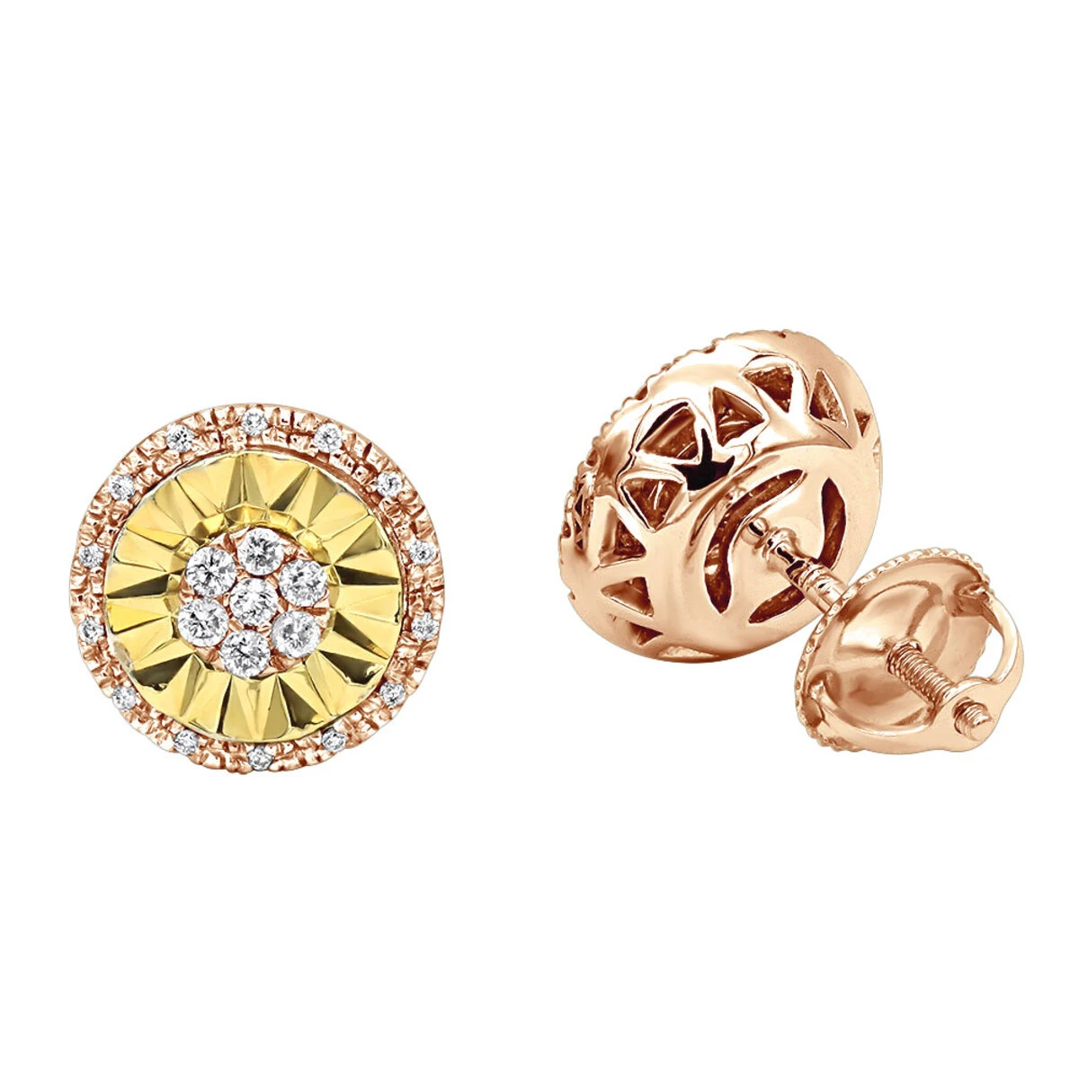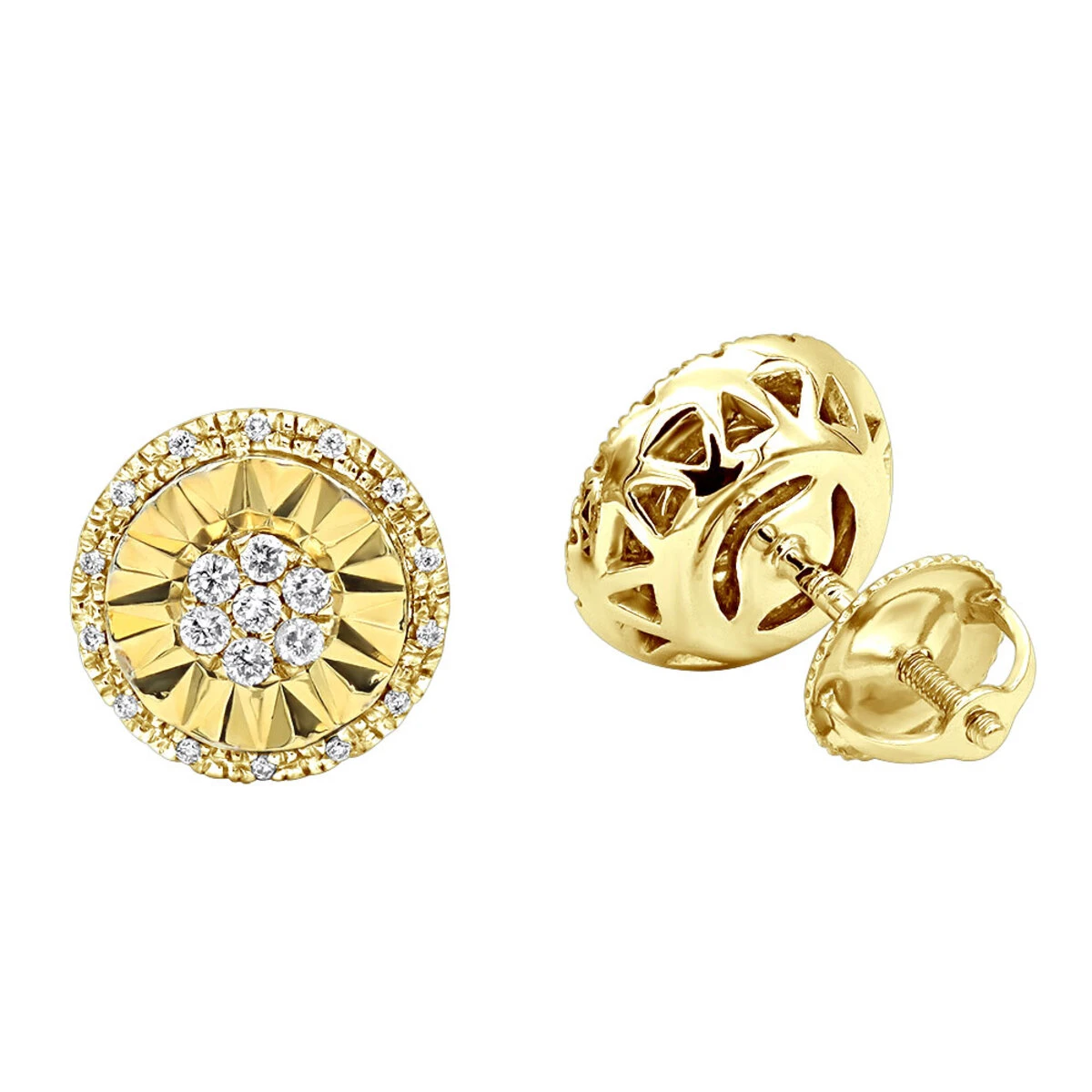From our unique diamond earrings for men and women and diamond stud earrings collections These 14K Gold Affordable Diamond Earrings Studs are huge and have a look of earrings with 2 carat center diamond due to their unique diamond setting and showcases 0.2 carats of sparkling cluster set round diamonds in the middle and a halo setting on the outside around the earrings. Available in 14K white, yellow or rose gold, these lovely unisex diamond earrings design makes diamonds in the middle look wrapped in gold, and the halo with white round diamonds adds even more sparkle. The earrings weigh approximately 3.5 grams, feature secure screw-back closure and quite large at 3/8in (10mm) in diameter, they will make an affordable yet very nice addition to any jewelry collection.