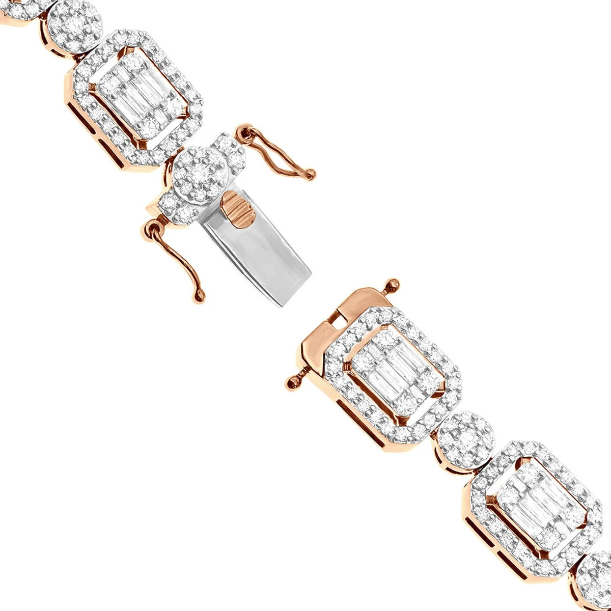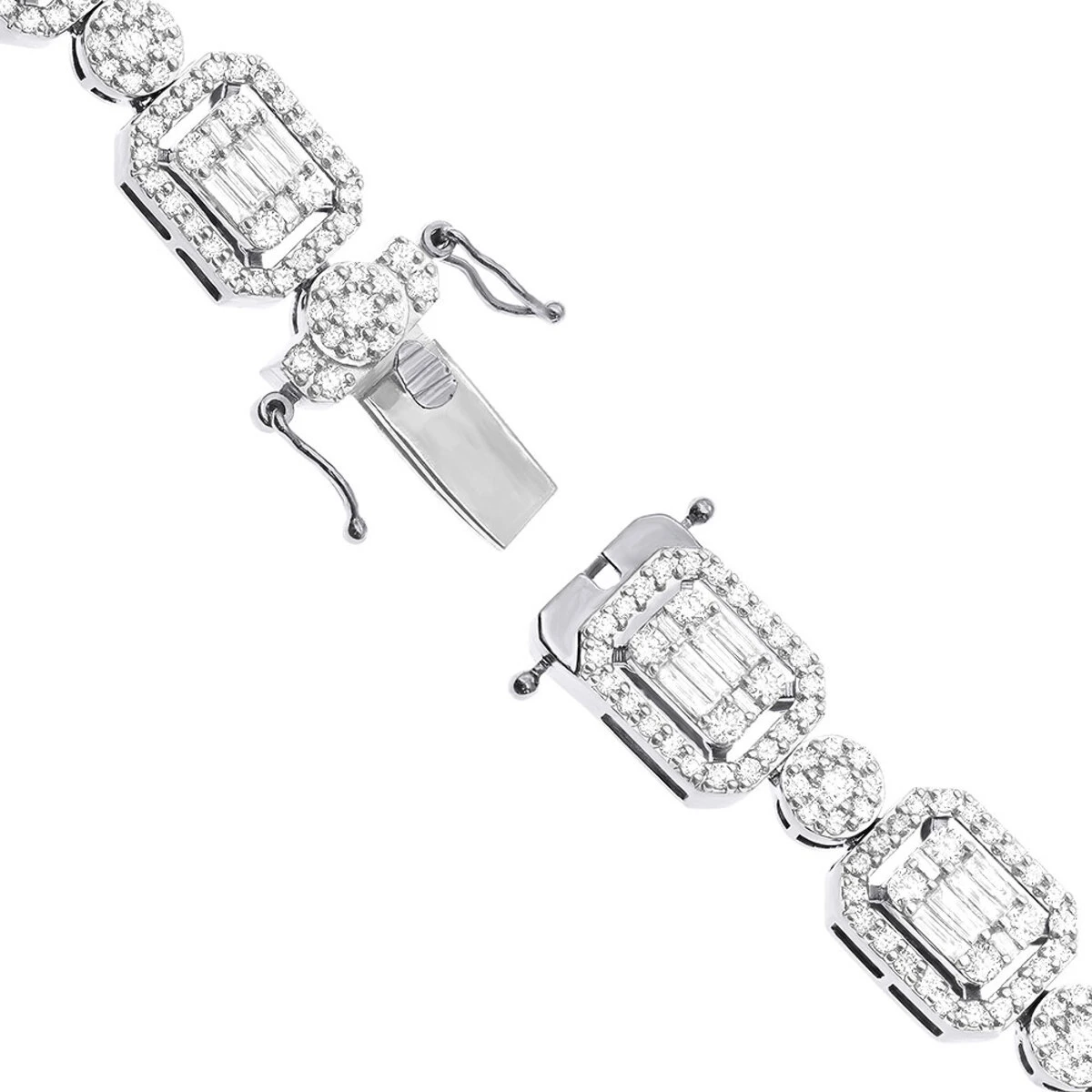 This spectacular and very unique diamond necklace for women in 10k gold weighs approximately 48 grams and showcases mind-blowing 17 carats of sparkling prong set and pave set diamonds. Featuring a unique design with baguette diamonds and round cut diamonds intricately set into highly polished octagon and round links, the necklace is available in 10K white, yellow and rose gold and can also be custom made in 14k gold and 18k gold. The width is 5/16in (9mm), the length is 19in (480mm). Please contact us if you would like it in a different length.